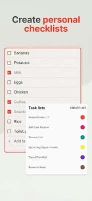 Izbaudiet gudru ikdienas uzdevumu pārvaldību, kurā nepabeigtie pienākumi bez piepūles tiek pārcelti uz nākamo dienu, nodrošinot, ka jūs nekad neko neaizmirstat un vienmēr sākat dienu ar skaidru mērķi. Izveidojiet neierobežotu skaitu pielāgojamu kontrolsarakstu – vai tas būtu iepirkumu saraksts, rīta rutīna, vēlmju saraksts vai svarīgi zvani – pielāgojiet tos savam unikālajam dzīvesveidam. Vizuāli kārtojiet savus sarakstus ar krāsu kodējumu, lai nekavējoties atšķirtu steidzamos uzdevumus no personīgajiem. Integrētais kalendāra skats palīdzēs plānot dienas, sekot līdzi termiņiem un redzēt gaidāmos pasākumus vienā acu uzmetienā.