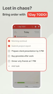 1 Day TODO: Daily Task Manager izceļas ar savu tīro un minimālistisko dizainu, kas novērš traucēkļus un palīdz koncentrēties uz svarīgāko. Intuitīvais interfeiss nodrošina, ka pat iesācēji var ātri apgūt un sākt efektīvi izmantot aplikāciju. Tā nav tikai vienkārša uzdevumu lietotne – tā ir sistēma, kas palīdz jums uzturēt kārtību, bez piepūles palielināt produktivitāti un nezaudēt kontroli pār svarīgiem mērķiem. Neatkarīgi no tā, vai jūs pārvaldāt ikdienas rutīnu, ilgtermiņa projektus vai komandas uzdevumus, 1 Day TODO: Daily Task Manager sniegs jums iespēju racionalizēt savu darba plūsmu un pārņemt kontroli pār savu laiku – soli pa solim.