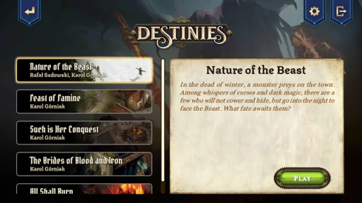 Uzreiz pēc scenārija izvēles Destinies lietotne nekavējoties ievedīs tevi tumšā fantāzijas stāstā, vienlaikus detalizēti vadot spēles sagatavošanā – sākot ar varoņu prasmēm un sākuma priekšmetiem, līdz pat kartes lauciņu izkārtojumam. Tā ir tavs stāstnieks, kas ievieš dinamiskus notikumus un palīdz orientēties nepārtraukti mainīgajā spēles pasaulē. Lietotne ir izstrādāta, lai iegaumētu katru tavu izvēli, radot reālas sekas, kas bieži vien neatgriezeniski maina spēles pasaules stāvokli.