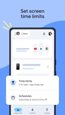 Mūsdienu digitālajā laikmetā ir svarīgi palīdzēt bērniem veidot veselīgus paradumus attiecībā uz tehnoloģiju lietošanu. Ar Family Link jūs iegūstat spēcīgu instrumentu, lai atrastu pareizo līdzsvaru jūsu ģimenei. Precīzi pārvaldiet ierīču lietošanas laiku, iestatot dienas ierobežojumus, kā arī speciālus grafikus skolas laikam vai dīkstāves periodiem, lai nodrošinātu atpūtu. Family Link ļauj jums elastīgi kontrolēt katras lietotnes izmantošanu — piešķiriet neierobežotu laiku izglītojošām lietotnēm vai bloķējiet tās, kas nav piemērotas jūsu bērnam. Tādējādi bērni var attīstīties digitālajā pasaulē, saglabājot veselīgu dzīvesveidu un koncentrējoties uz to, kas ir svarīgi.