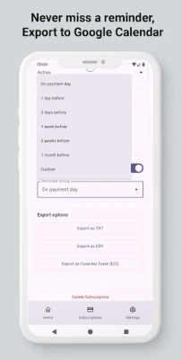 Ar "Subscription Renewal Tracker" viedajiem paziņojumiem jūs saņemsiet atgādinājumus tieši tad, kad jums tas ir nepieciešams – 30, 7 vai 1 dienu pirms termiņa, vai jebkurā pielāgotā laikā. Mūsu unikālā fona uzturēšanas tehnoloģija garantē, ka atgādinājumi darbojas nevainojami un nepārtraukti, pielāgojoties visiem norēķinu cikliem. Iegūstiet pilnīgu finanšu pārskatu, vizuāli redzot savas ikmēneša un gada abonementu izmaksas. Sekojiet līdzi tēriņu tendencēm, identificējiet liekus izdevumus un plānojiet savu budžetu, izmantojot integrētos rīkus, kas atbalsta vairāku valūtu. Nemaz nerunājot par iespēju eksportēt abonementus uz Google kalendāru, lai vienmēr būtu informēti par gaidāmajiem maksājumiem.