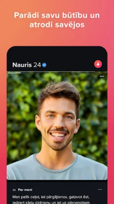 Miljoniem lietotāju visā pasaulē atzīst Tinder par vadošo platformu jaunu cilvēku satikšanai. Mūsu pamatprincips ir vienkāršs un efektīvs: saderības, čats, tikšanās. Veidot savienojumus ir intuitīvi – izveido savu profilu ar labākajām fotogrāfijām un pievieno aprakstu, kas atklāj tavu personību. Pārlūko profilus, "velkot pa labi", ja sajūti simpātijas, vai "velkot pa kreisi", ja vēlies turpināt meklēšanu. Savienojums tiek izveidots tikai tad, ja simpātijas ir abpusējas, nodrošinot, ka sarunas sākas ar savstarpēju piekrišanu un interesi.