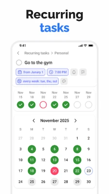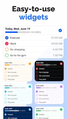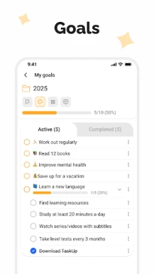Lai vēl vairāk uzlabotu pārvaldību, "TaskUp" piedāvā mērķu sarakstu, kas palīdzēs jums noteikt ilgtermiņa mērķus un sekot līdzi to progresam, uzturot motivāciju. Izveidojiet detalizētus kontrolsarakstus, lai nodrošinātu, ka katrs solis tiek izpildīts. Organizējiet savu darbu ar pielāgotām atzīmēm un prioritātēm, kas nodrošina ātru navigāciju un uzlabotu uzdevumu pārvaldību. Iestatiet atkārtotus uzdevumus regulārām darbībām, lai tās nekad netiktu aizmirstas. Piekļūstiet saviem uzdevumiem un darāmo darbu sarakstiem tieši no sākuma ekrāna, izmantojot pielāgojamus logrīkus. Ar "TaskUp" jūs gūsiet pilnīgu kontroli pār savu laiku un aktivitātēm.